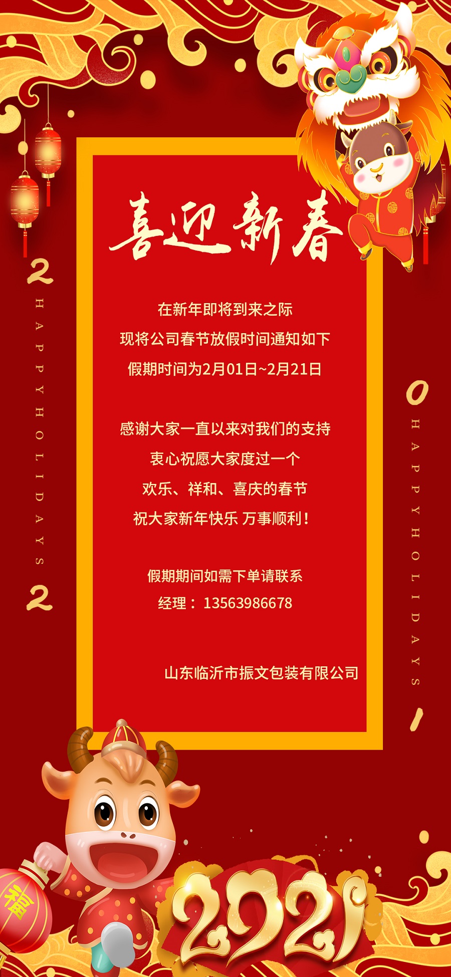 尊敬的各位客戶、各位伙伴: 衷心感謝您過去一年的支持與信任,也衷心感謝振文包裝全體家人這一年的辛勤付出。春節來臨之際,公司2021年春節放假安排如下: